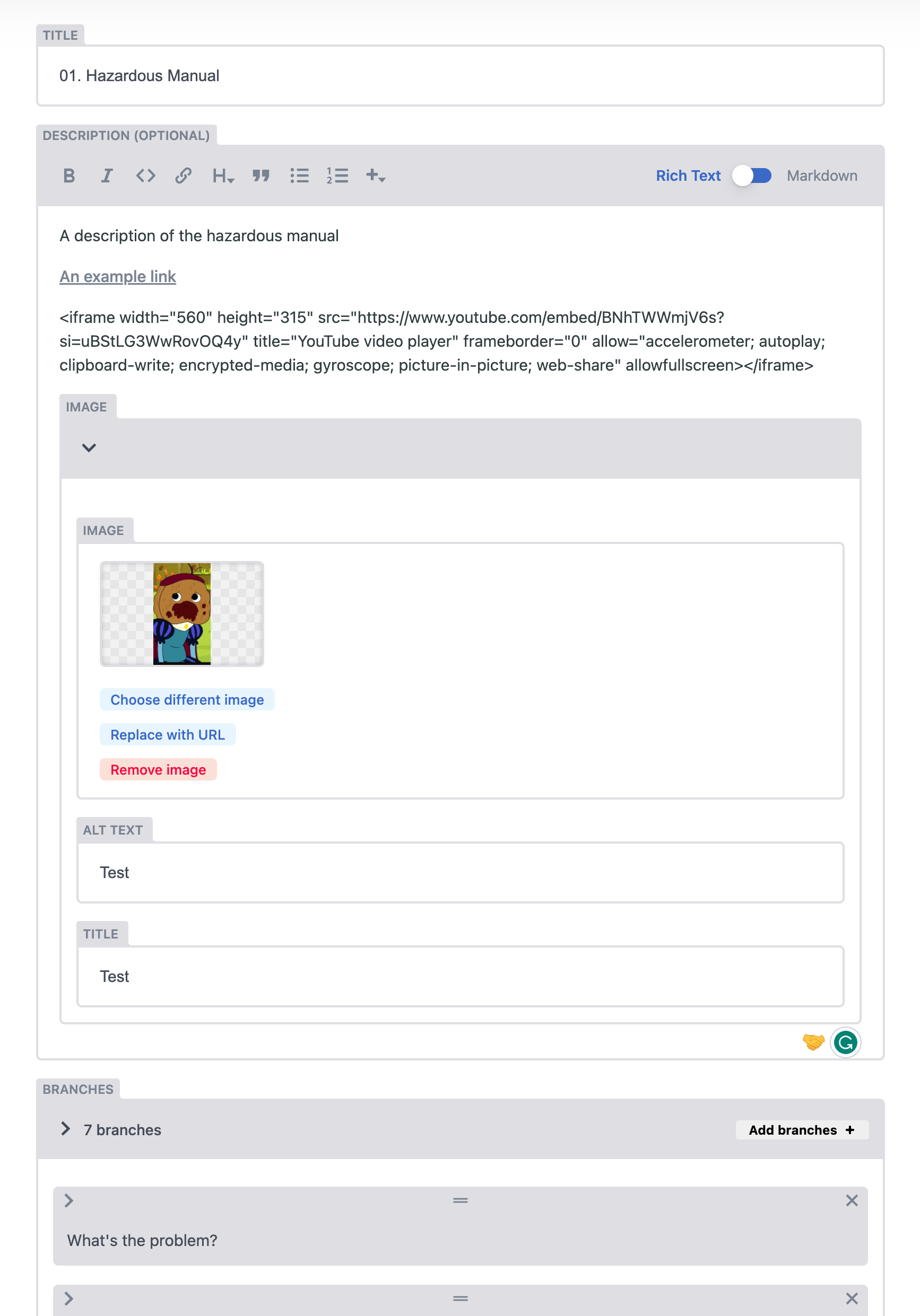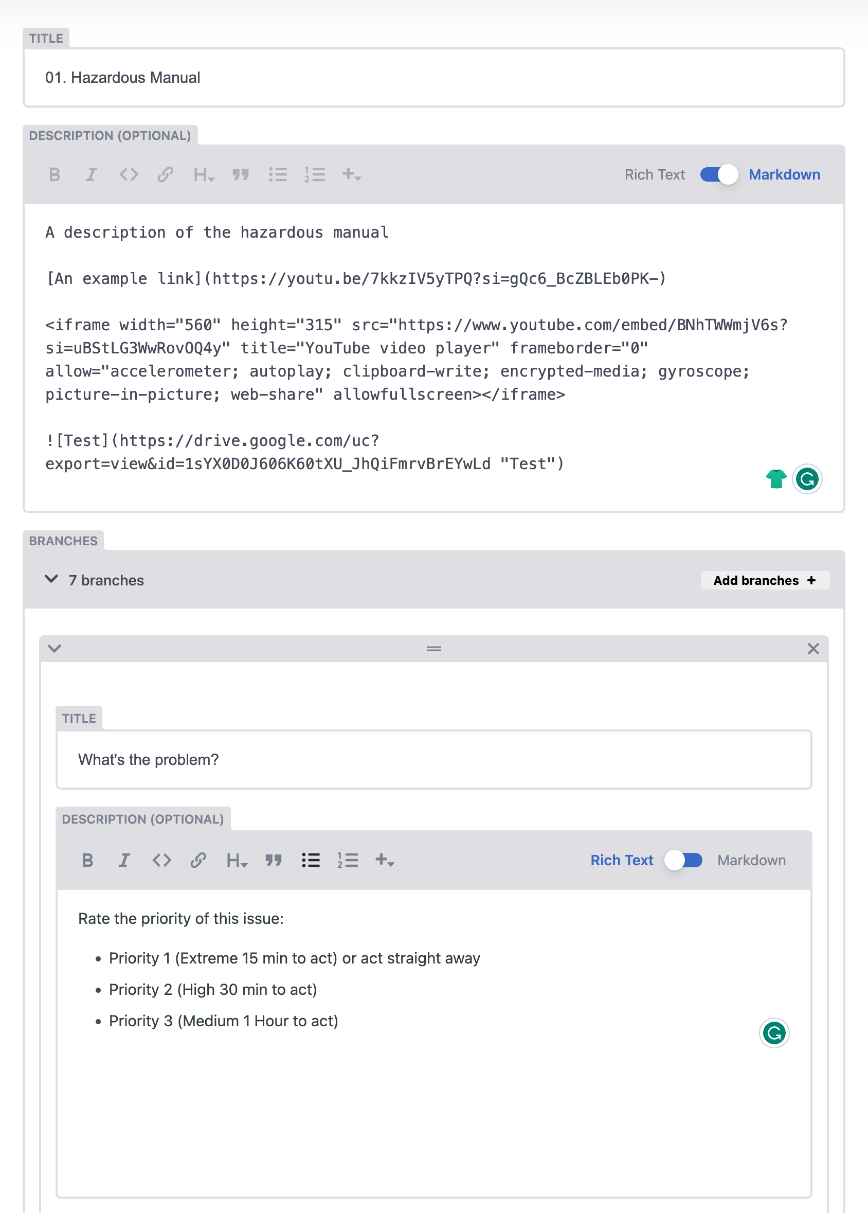 When editing content description fields, they can be edited in either Rich Text or Markdown views.