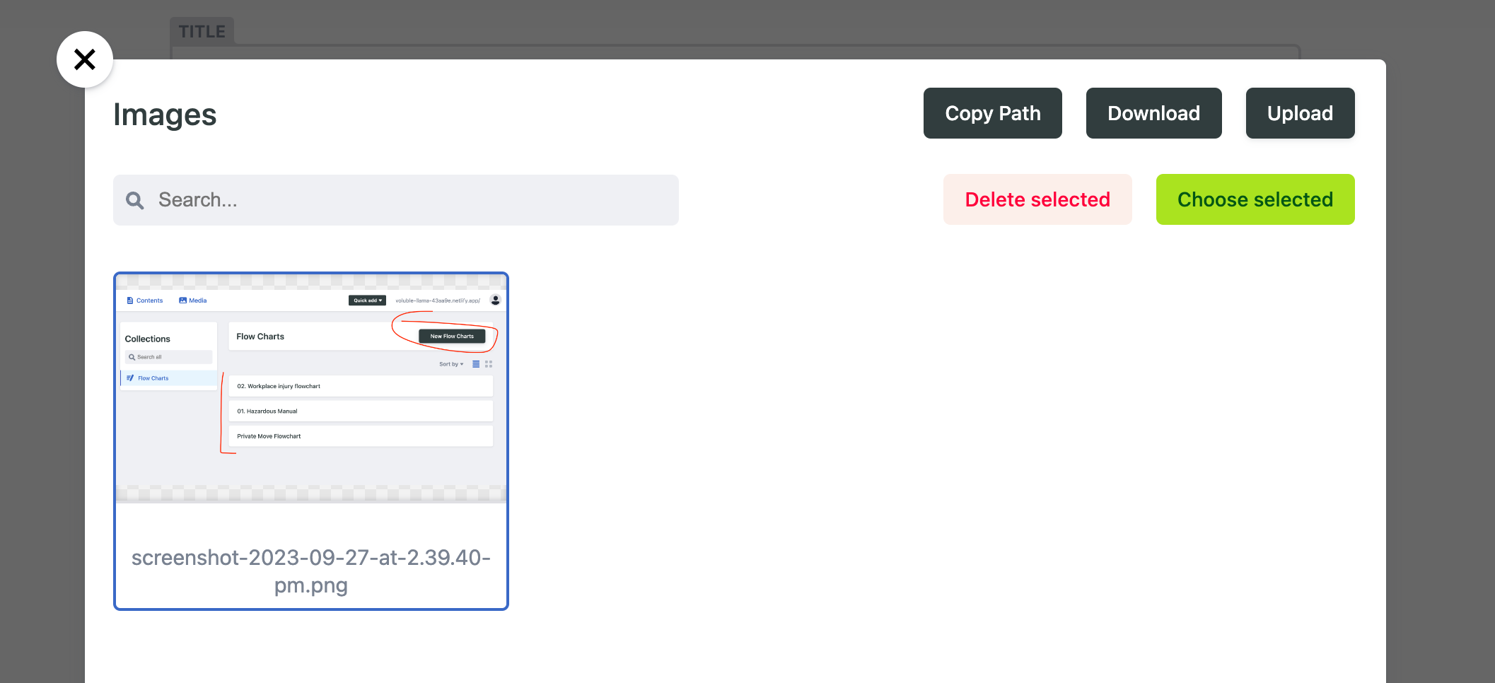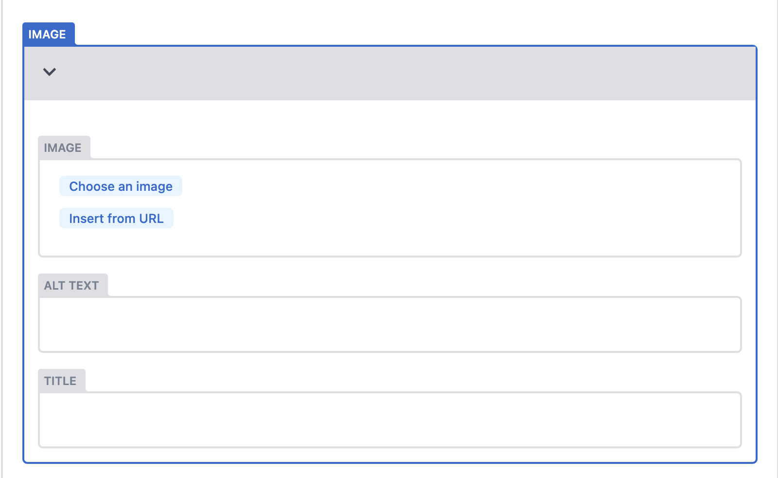 You will be presented with the below widget which will allow you to either upload an image by clicking "Coose an image" or to insert an image from a URL. This allows insertion of images from google drive or similar but is not necessary.