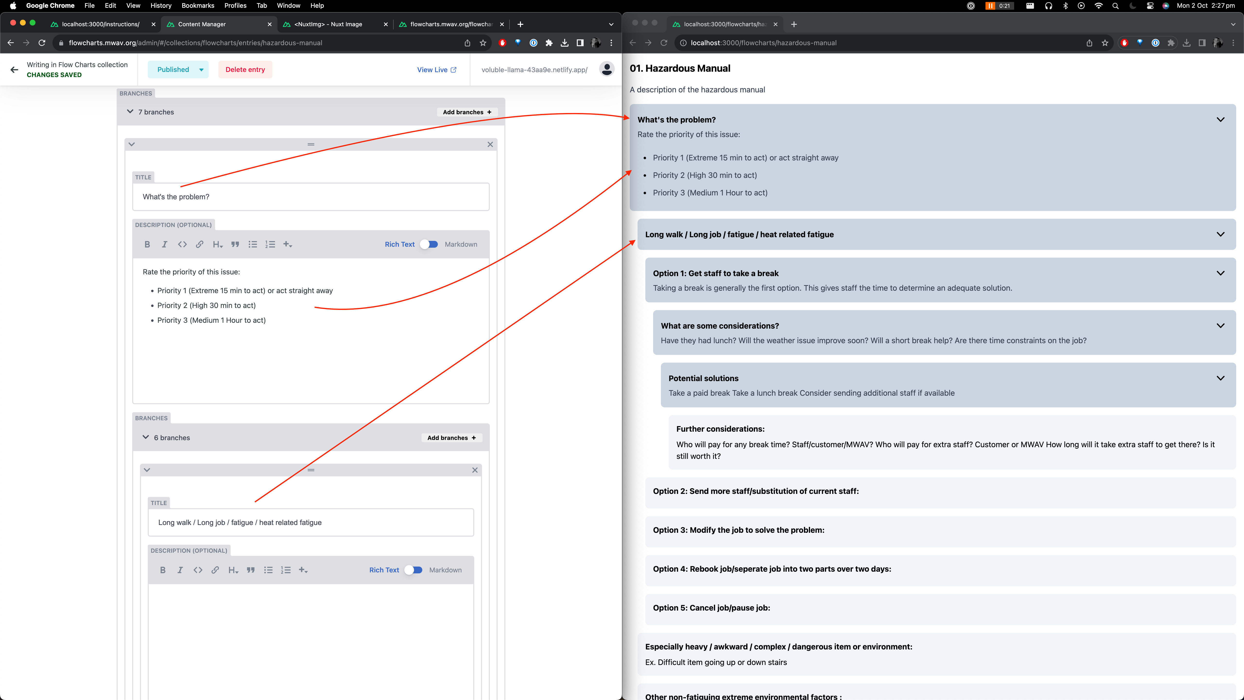 The image above attempts to show the basic structure of a flowchart which can next up to 7 levels deep to allow for a lot of flexibility when presenting question/answer based information.